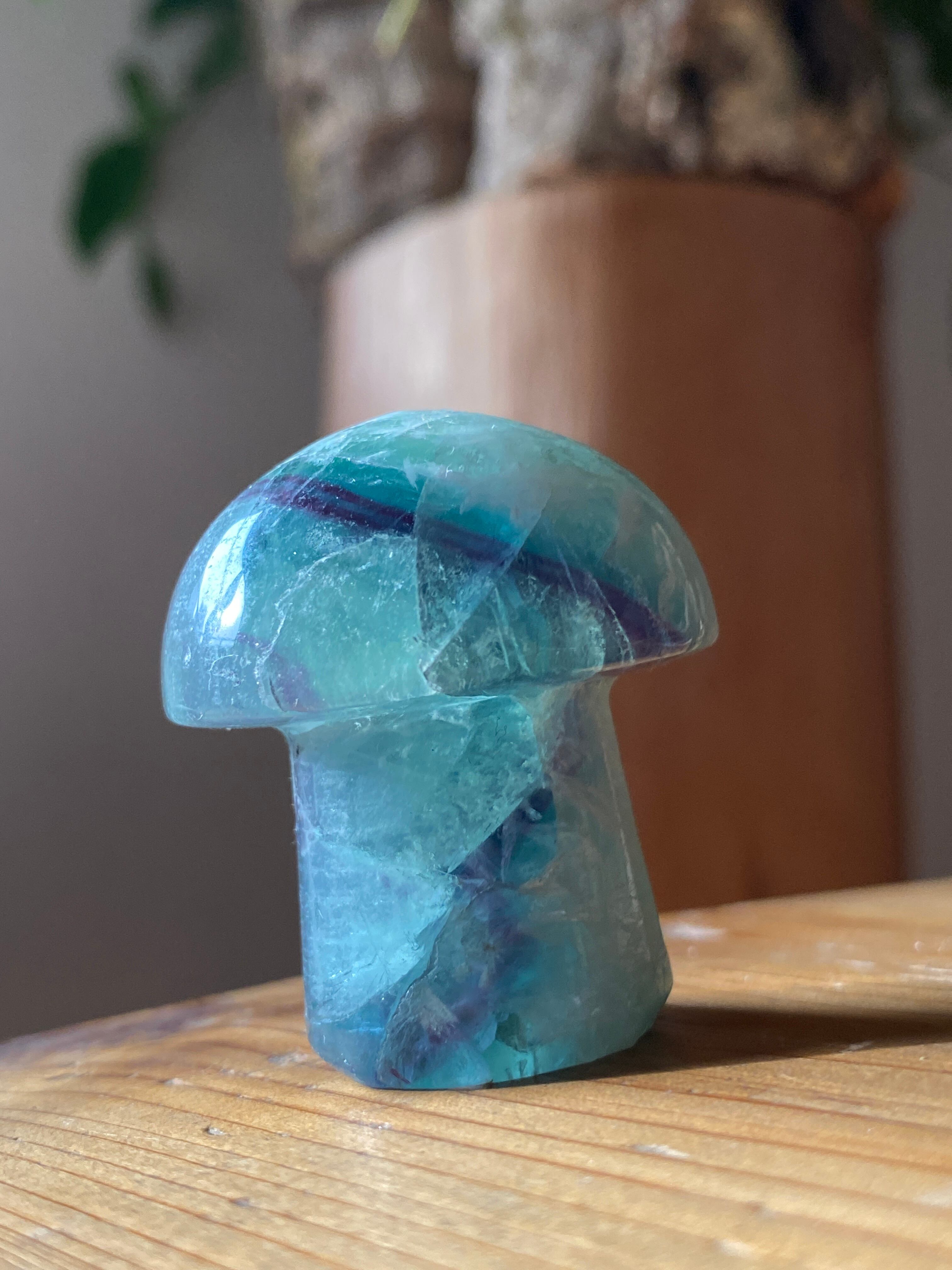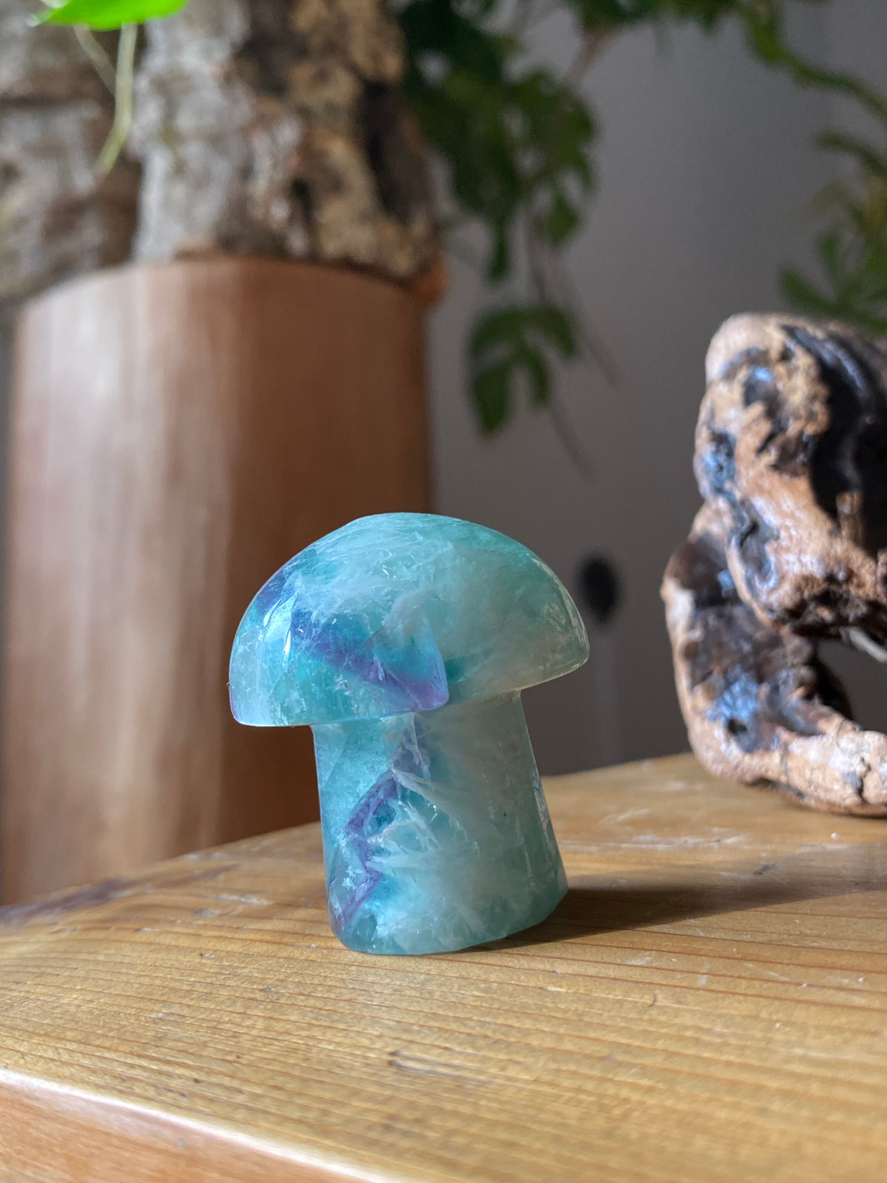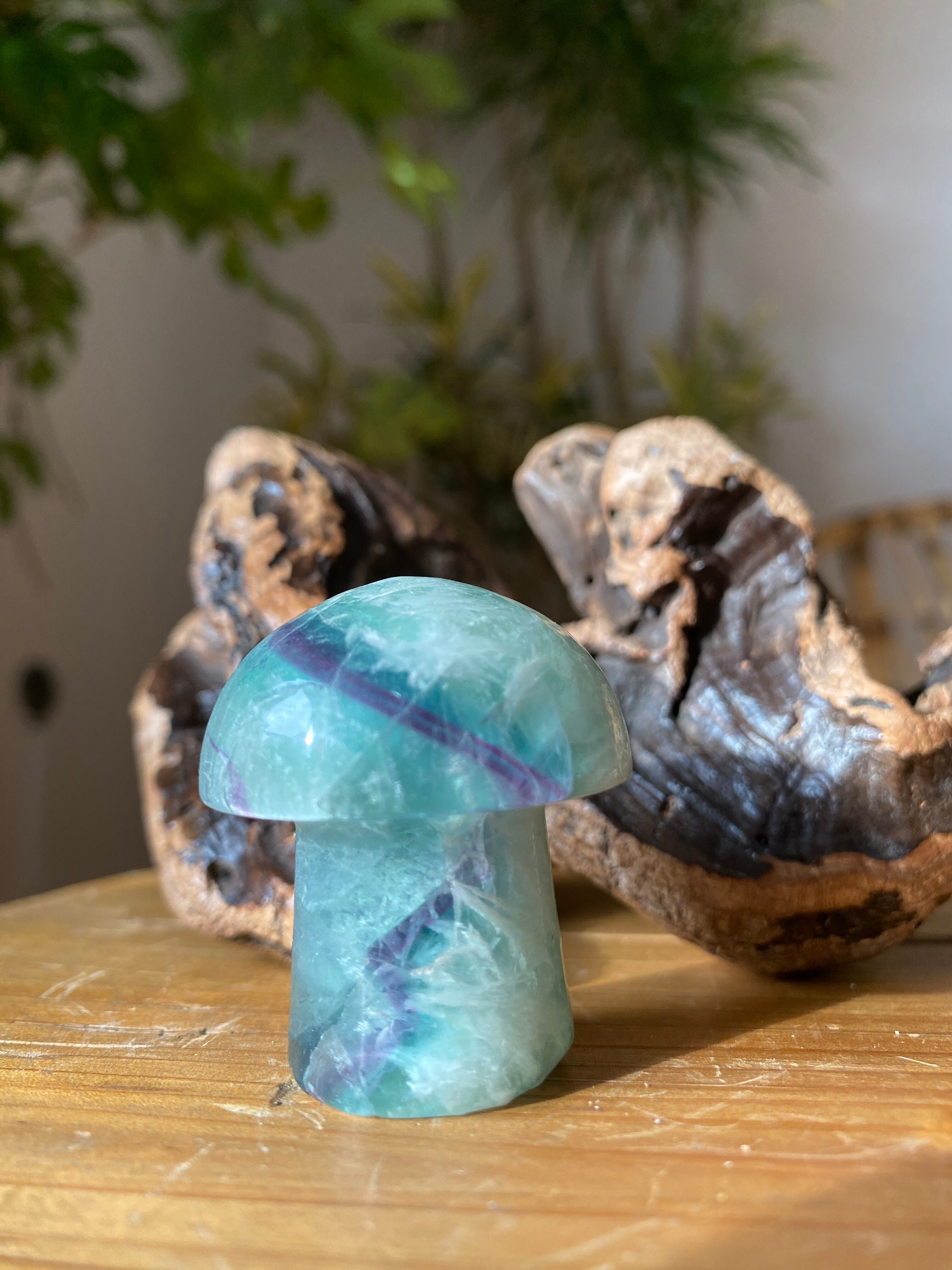 マッシュルームのかわいらしい姿をしたエンジェルフェザーフローライト。土の気を吸い上げ運気をあげるマッシュパワーと優しく包み込む天使の癒し羽根模様が入った美しいレア石です。