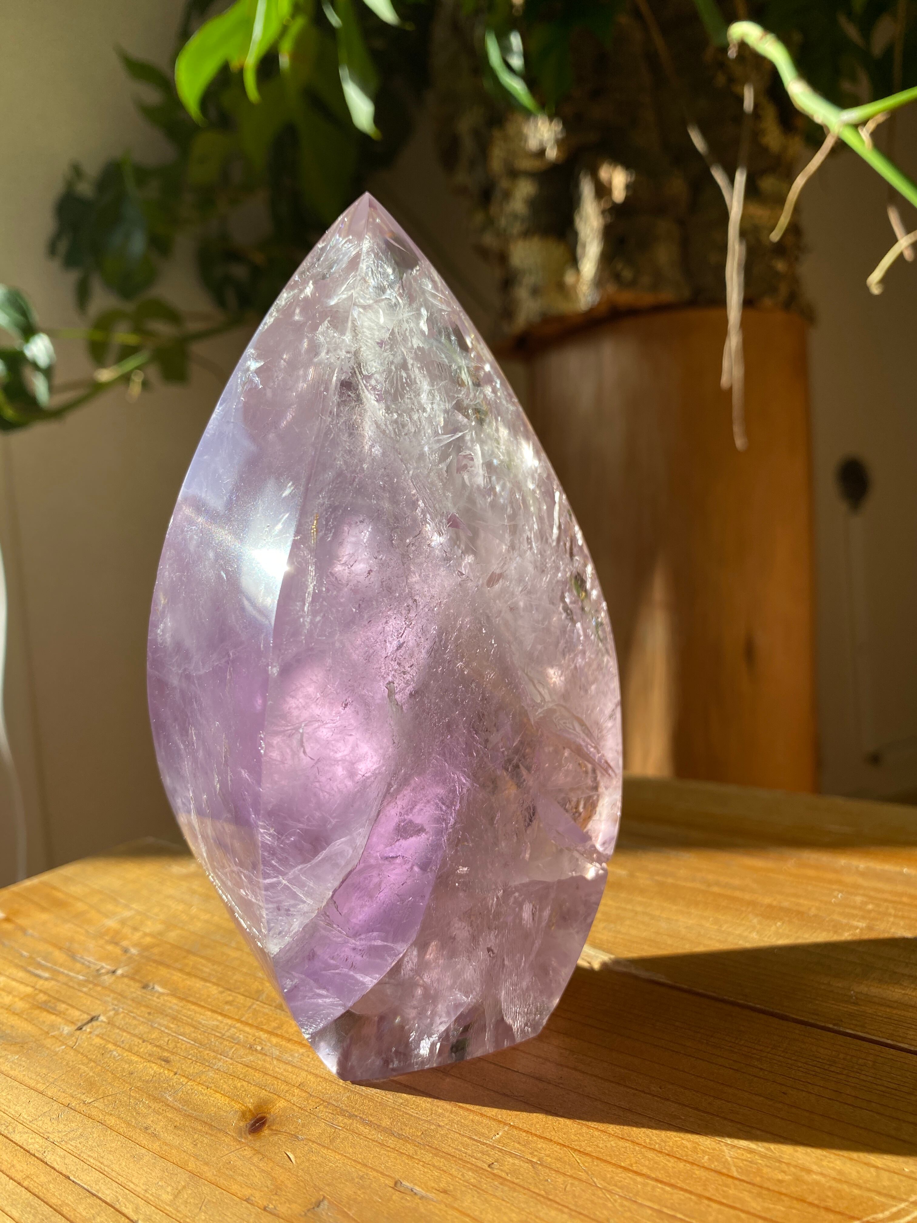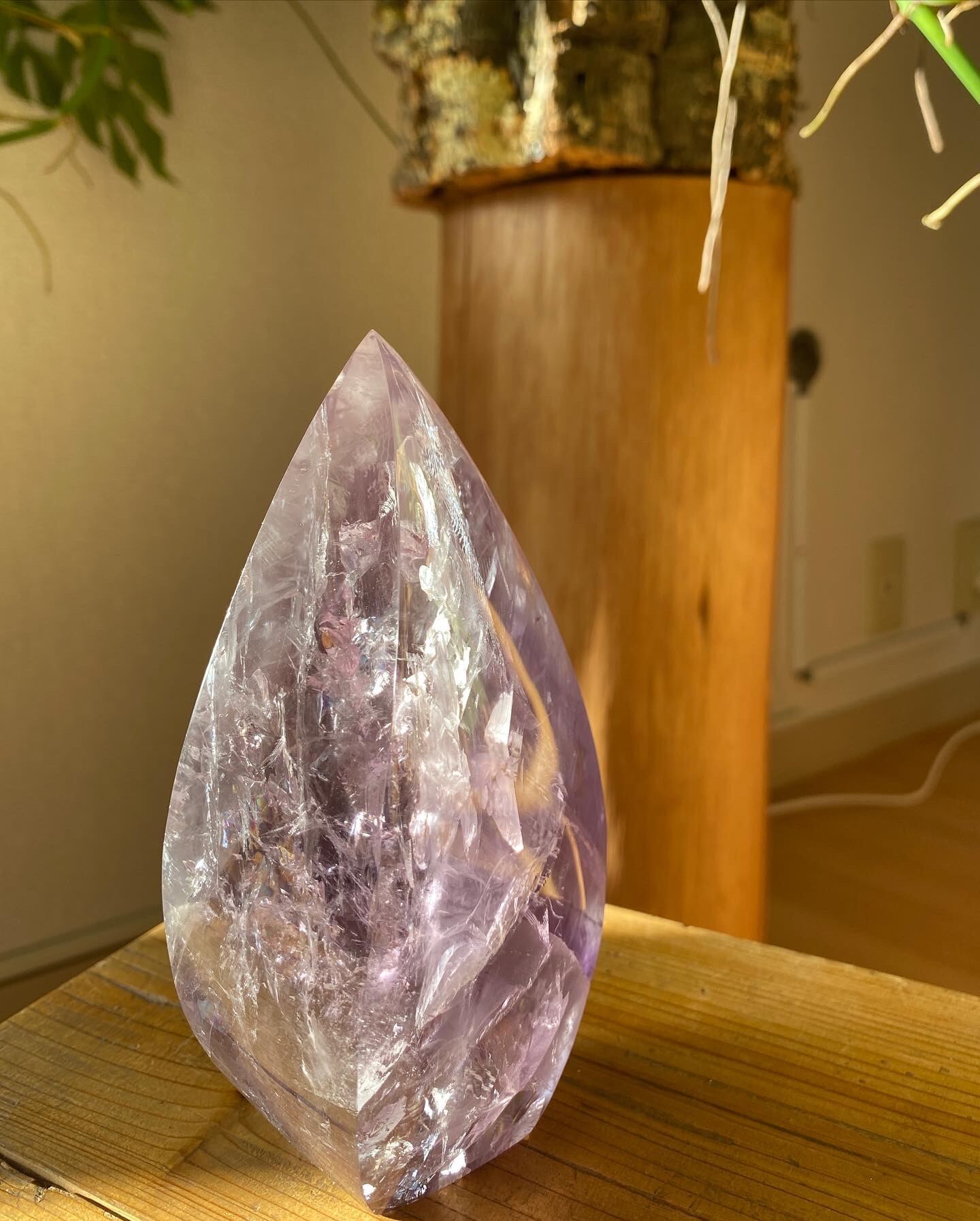 インクルージョンにおり重なり虹が美しく、透明感と艶やかなボディが光を受け取りエネルギーを放つ最高のお品です。リュクス感溢れる希少なアメジスト。