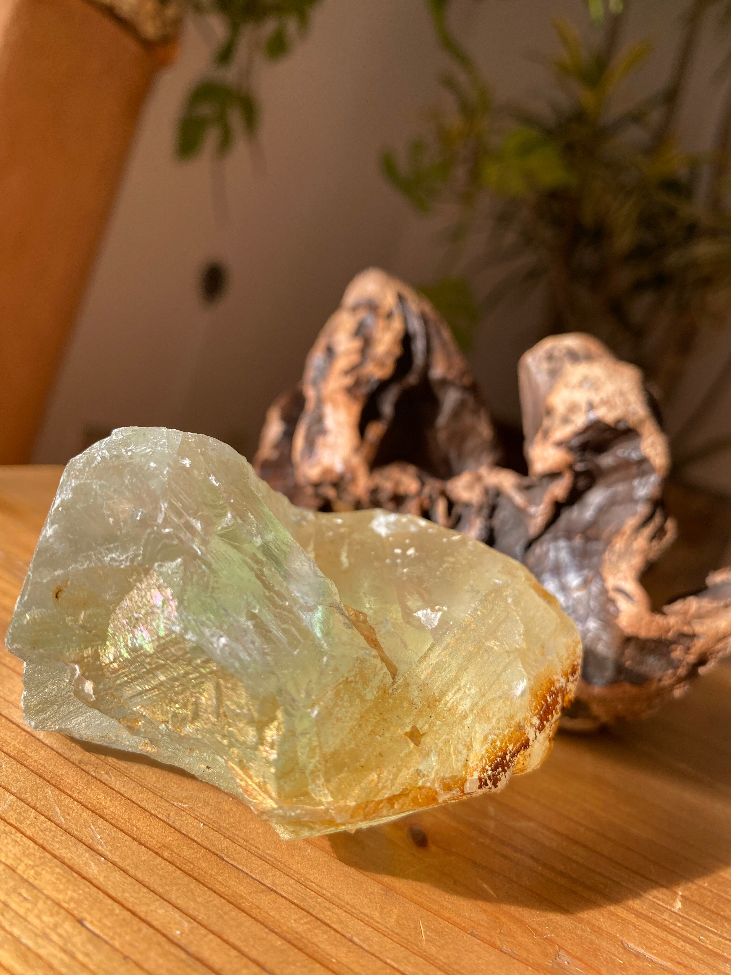 光を取り込むグリーンフローライトは虹たっぷりの優しいエネルギー。原石は自然のまま恵パワー溢れています。好みの置き方で様々な美しさを観賞でき幸せな気分にさせてくれます。