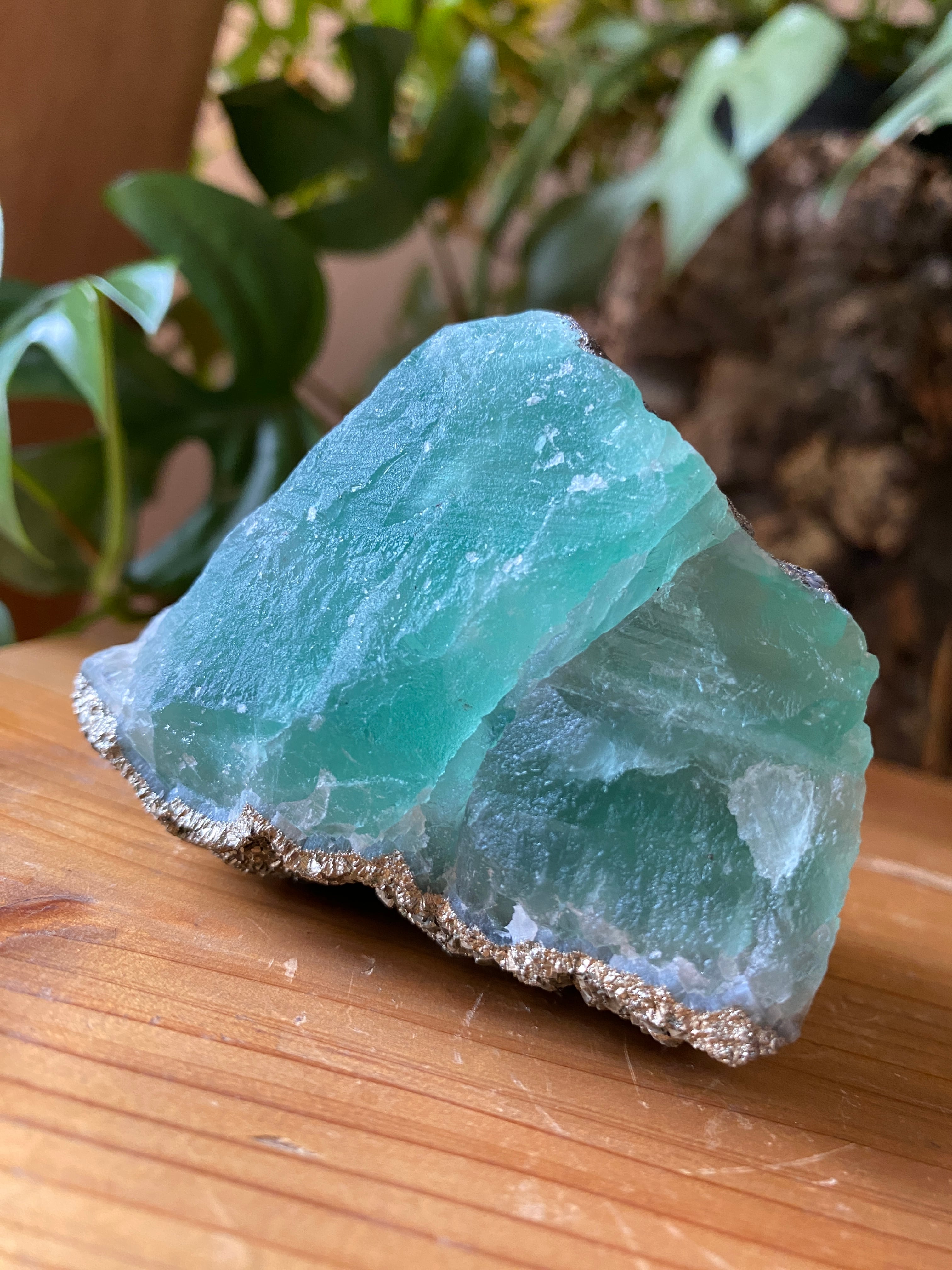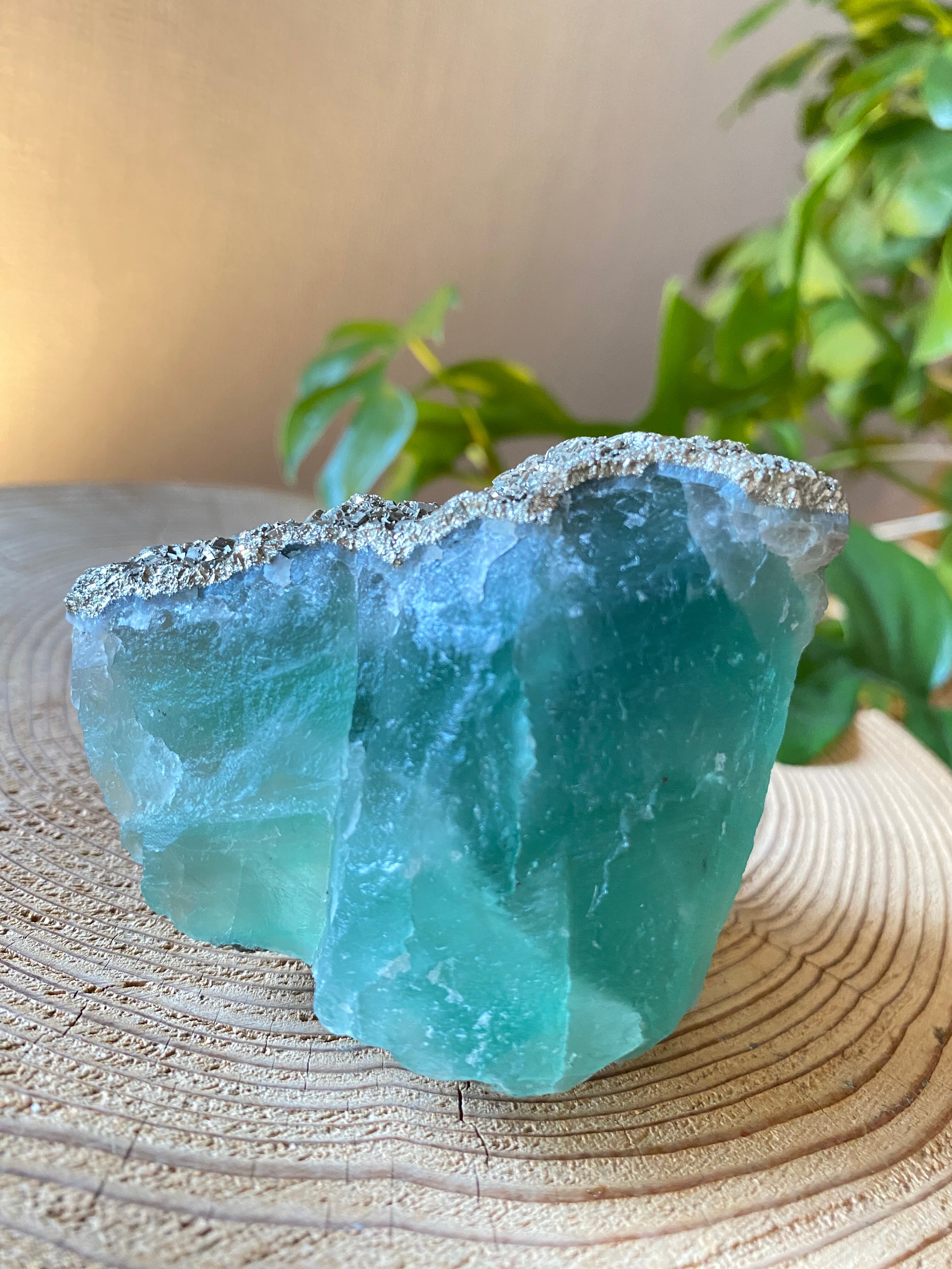 煌めくパイライトを纏う優しいブルーグリーンのフローライト。何層にも重なってみえる美しい色合いです。