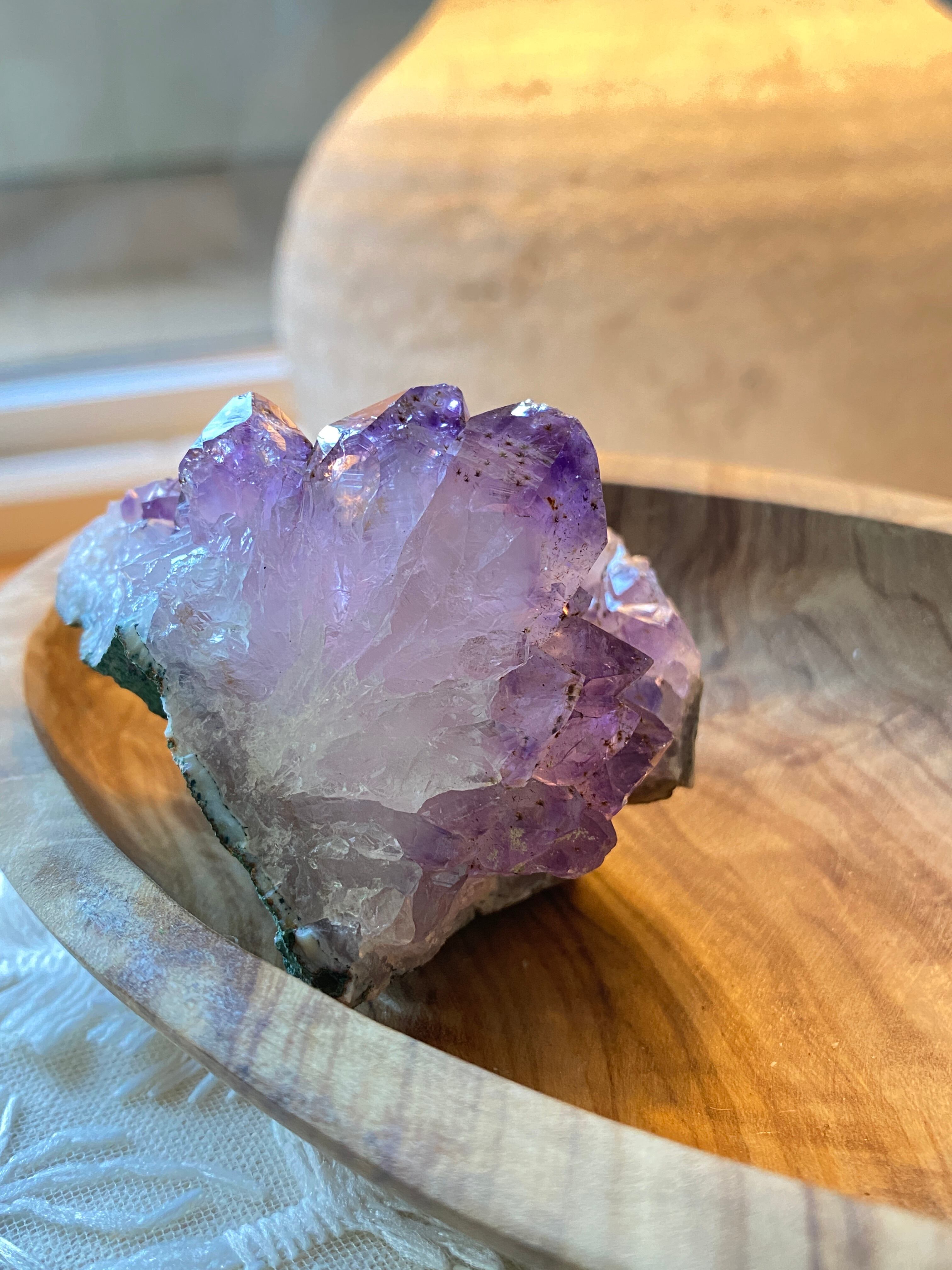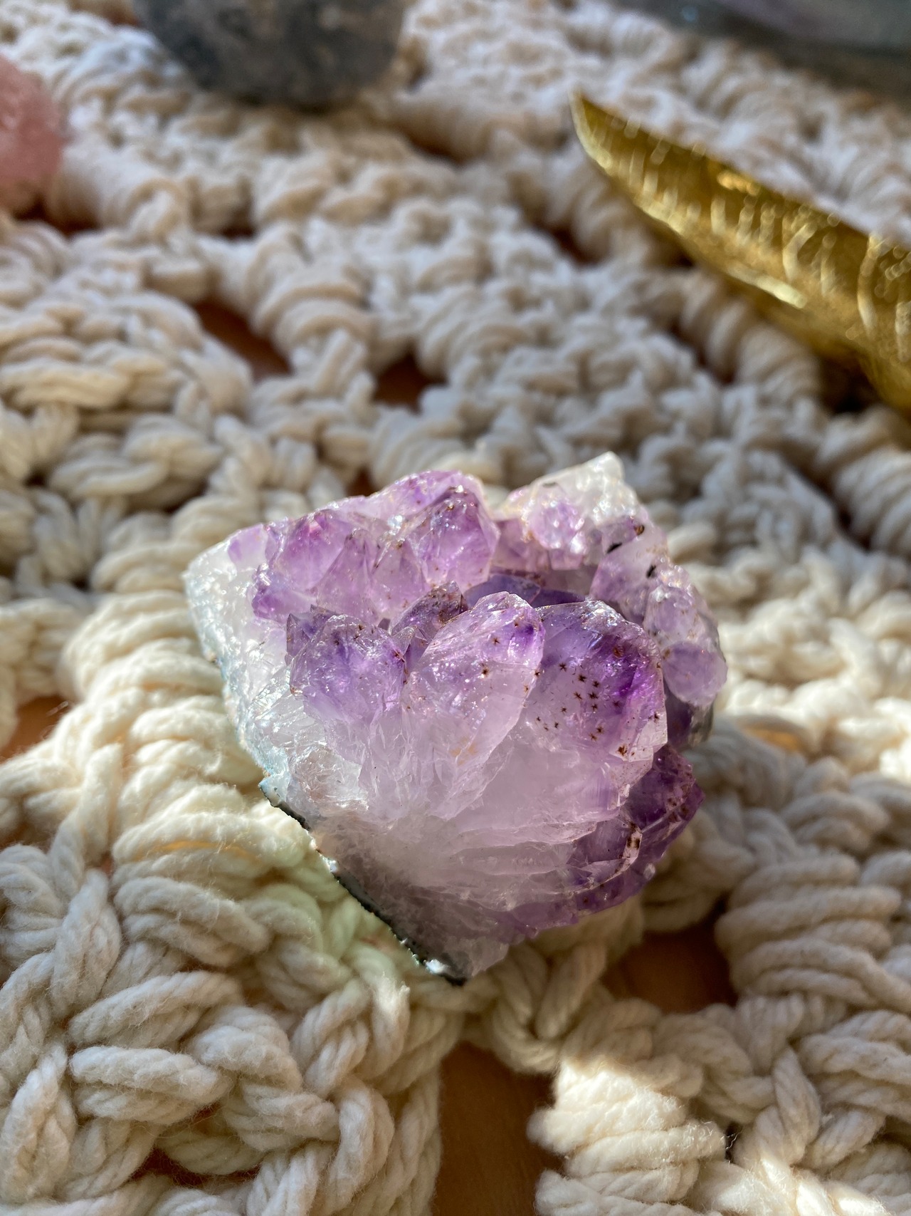 写真は太陽光が当たった時と室内での撮影した画像です。ひとつひが美しいクォーツの集まった可愛らしいアメジスト。災いから身を守り、前向きに必要なご縁や目標に引っ張ってくれる頼りになるパワー石です。