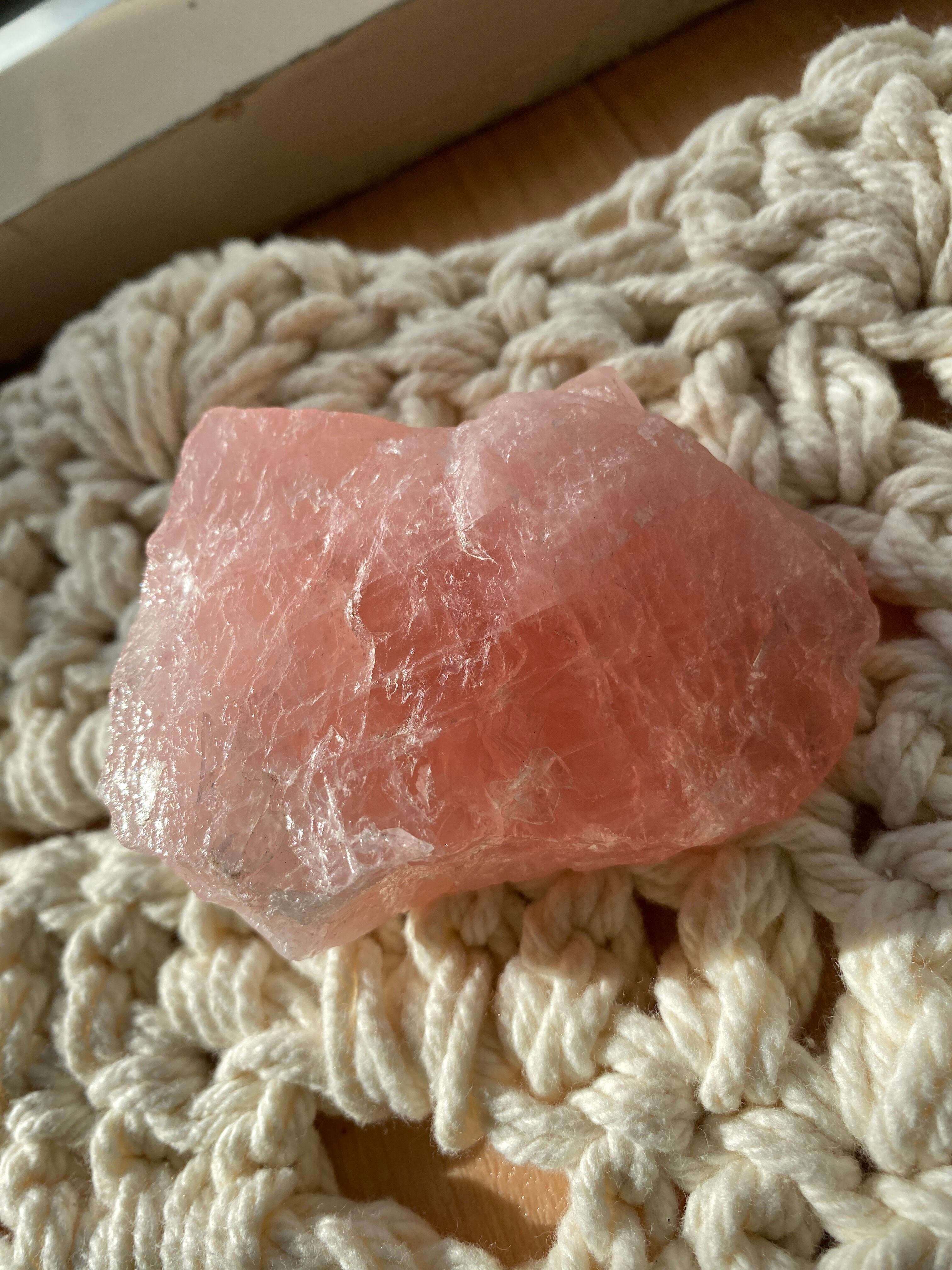 サーモンピンクがかわいらしい人気のローズクォーツ原石です。あえて最小限の加工で原石そのままの姿がパワーを感じられます。内面からオーラをピカピカにし、優しく穏やかな感情に。魅力アップ、向上心アップのパワー。