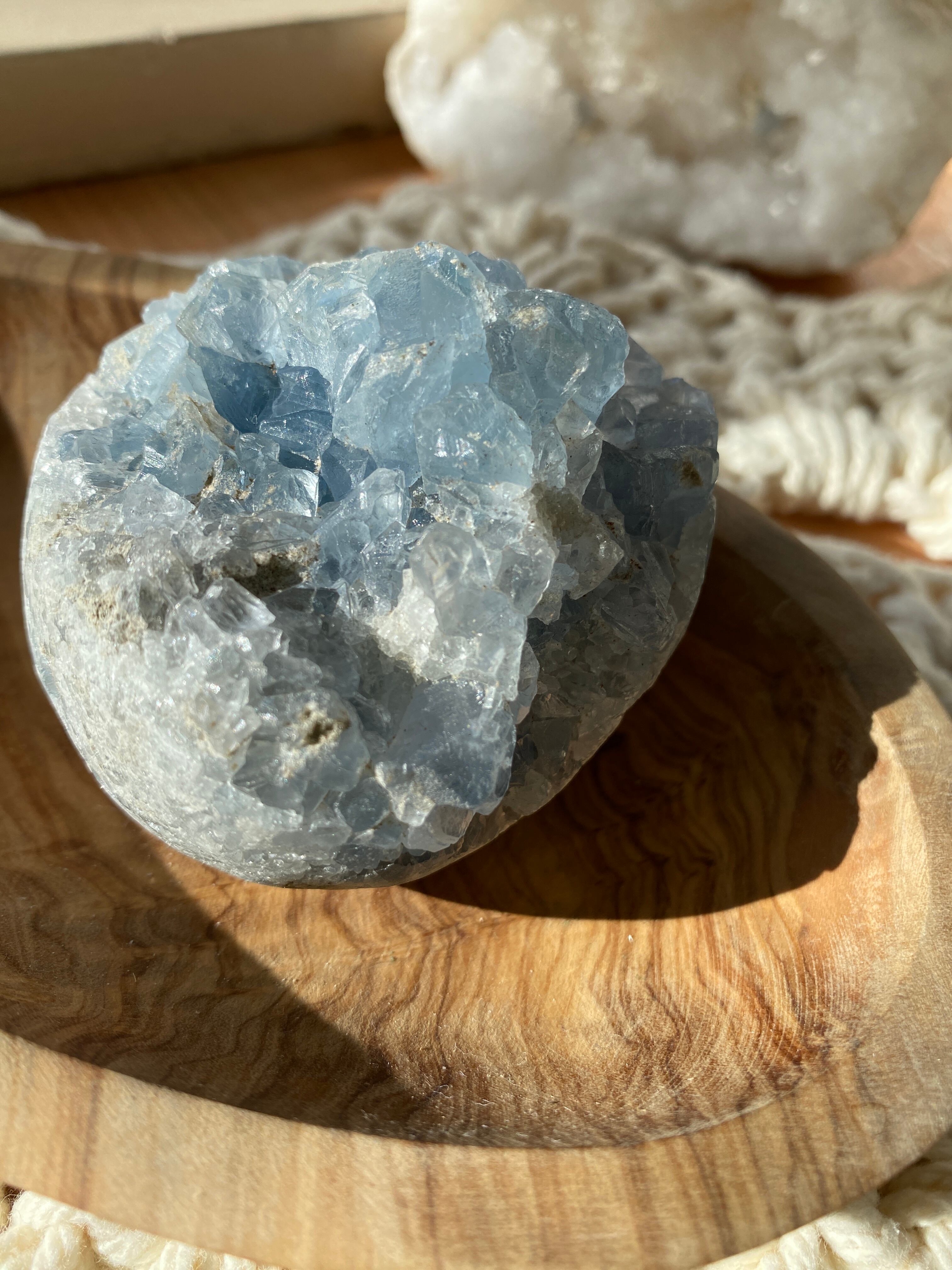 コロンと可愛らしいセレナイトエッグ形で美しい澄んだ水色のクォーツが心洗われるような気持ちに。