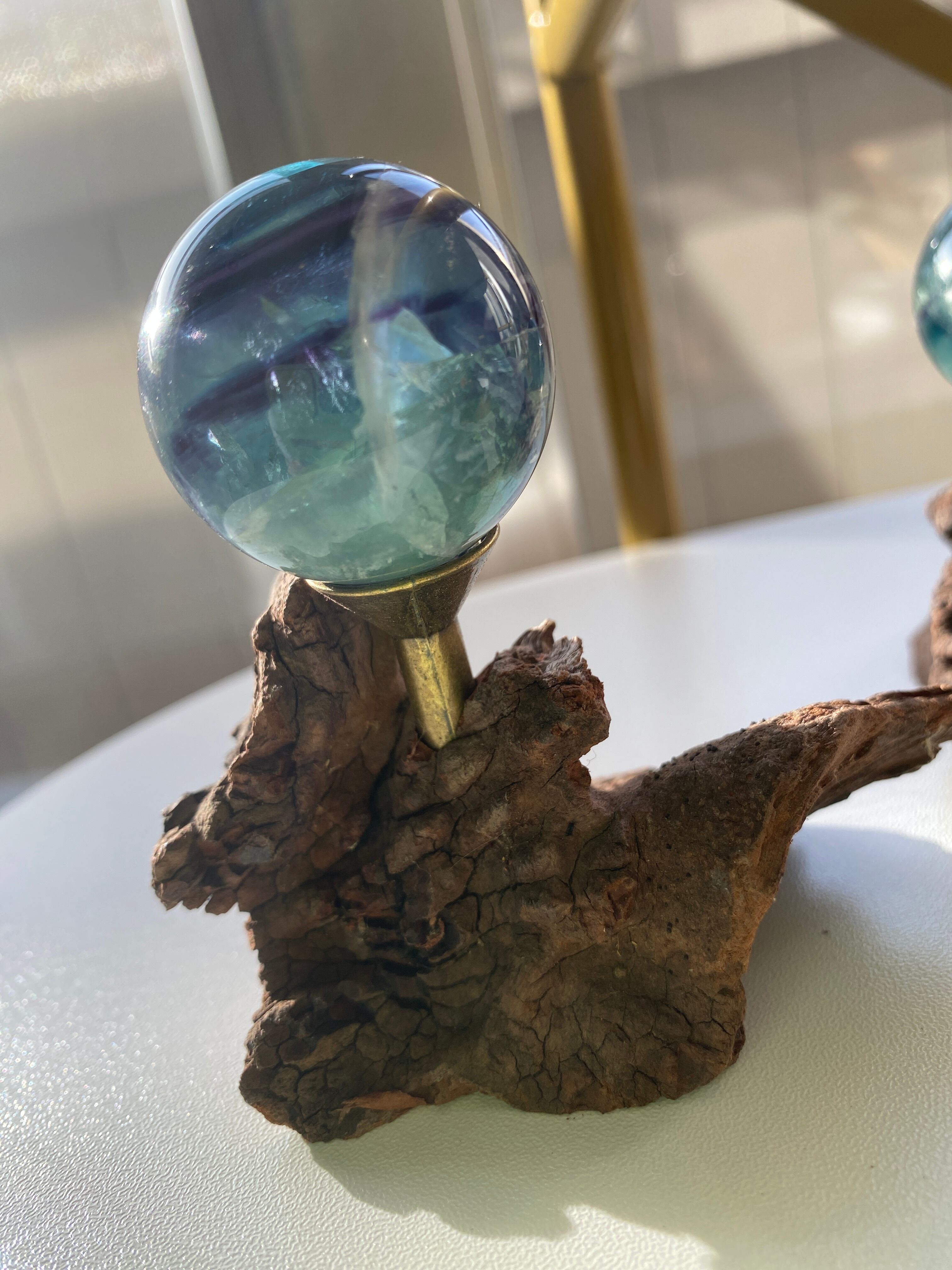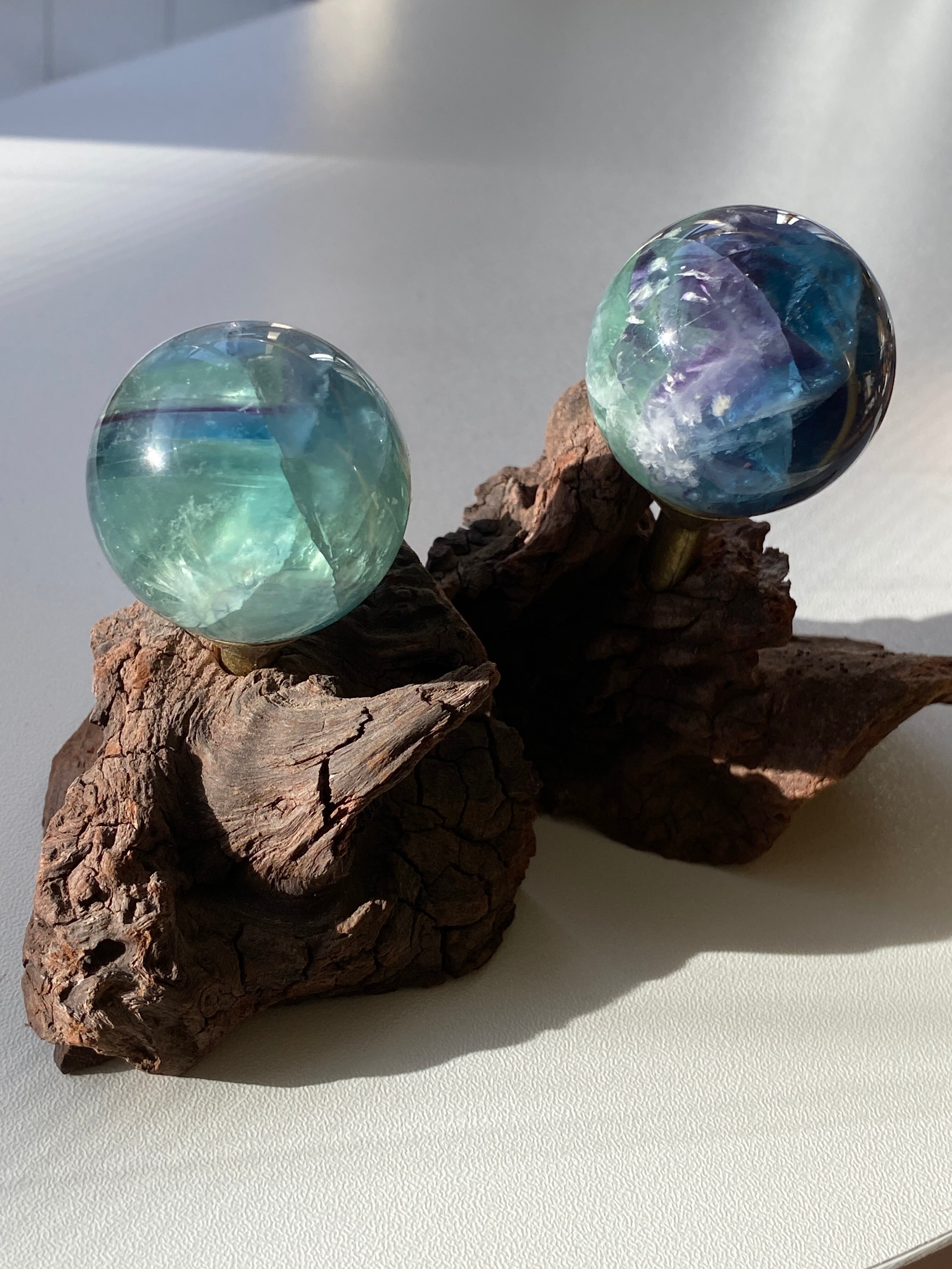 360度美しさを愉しめる淡いグリーンのフローライトスフィア。フローライトは優しい癒しパワーが強いですが、スフィアは特に360度全てからパワーが巡り受け取れる特別なお品です。