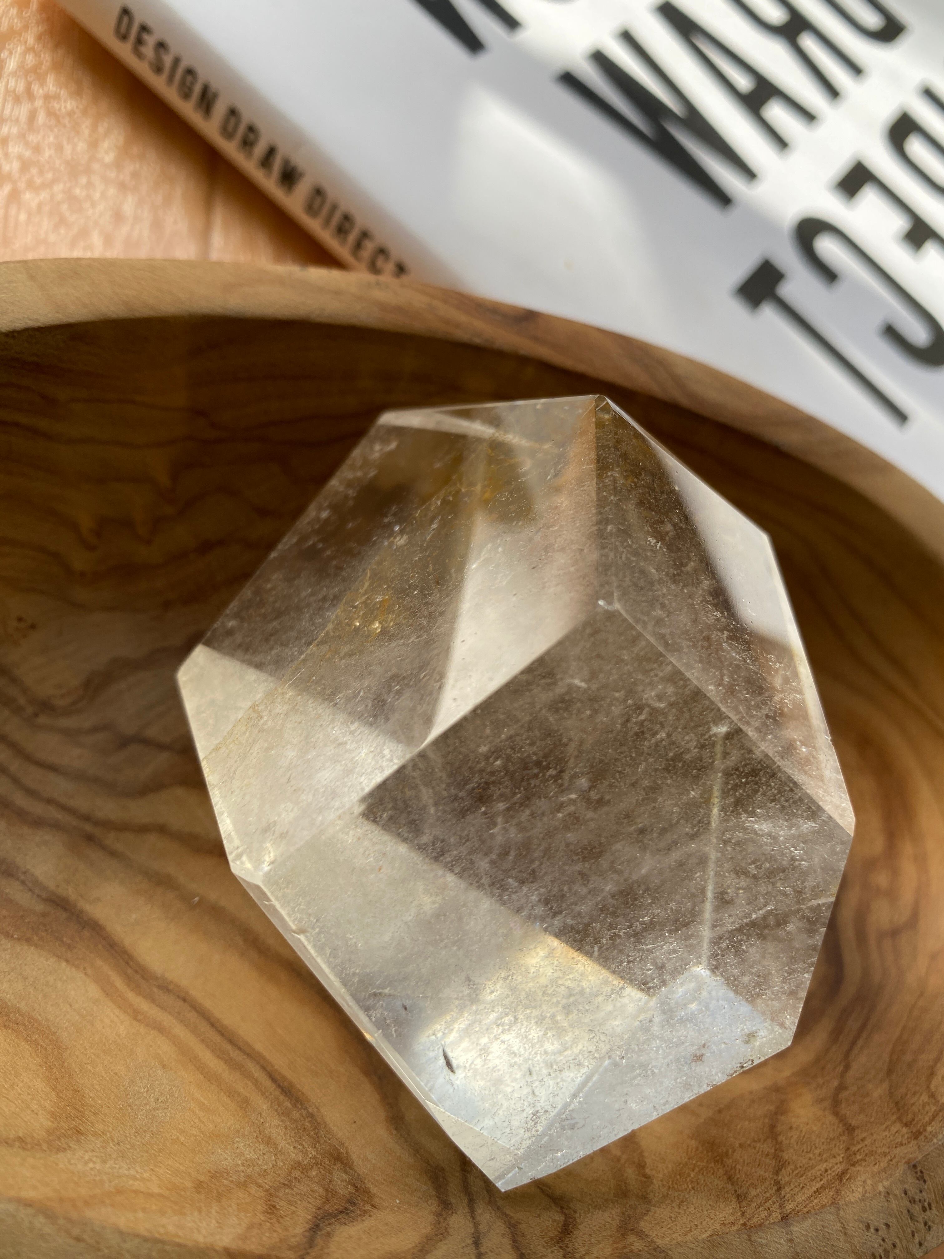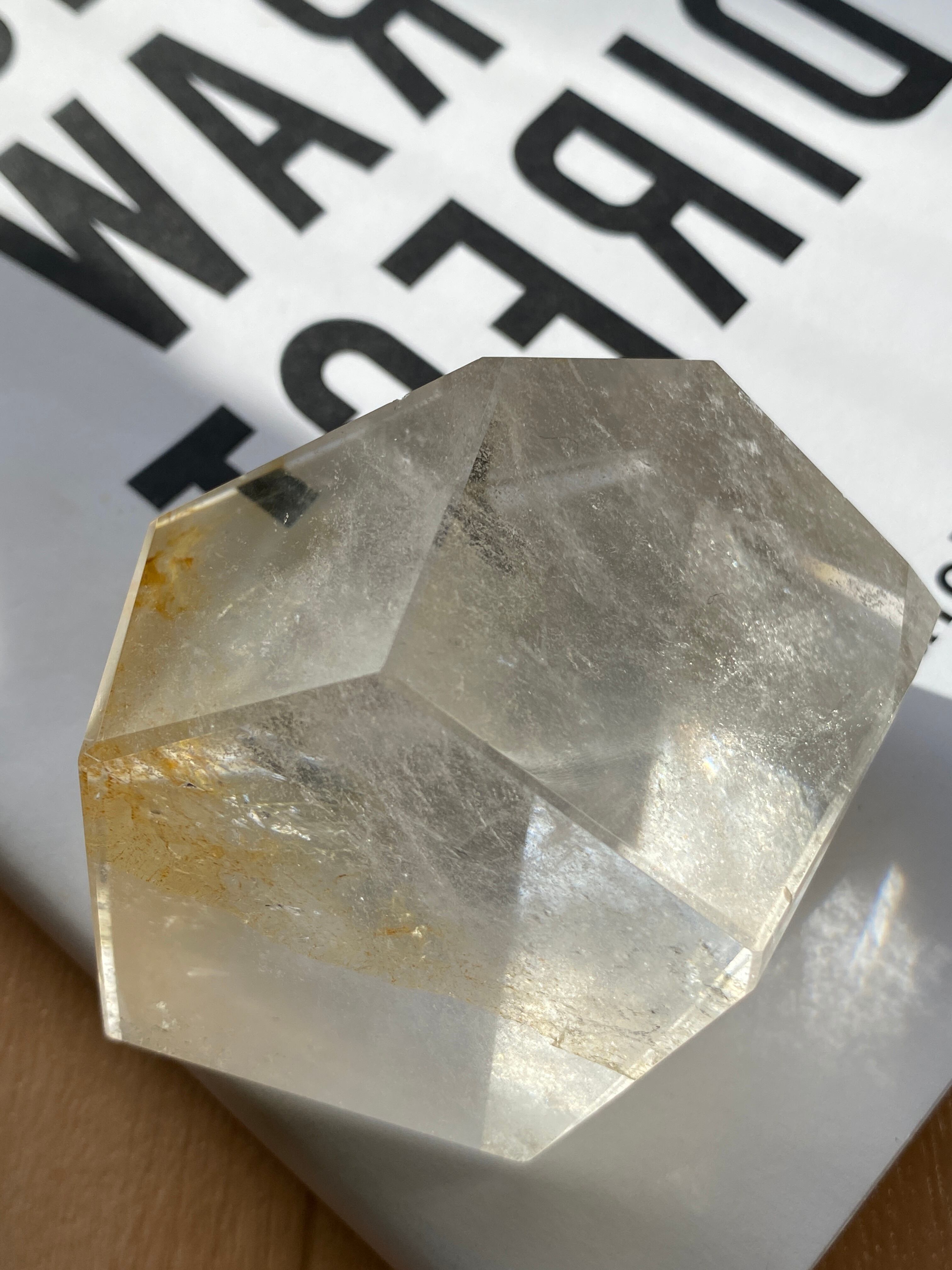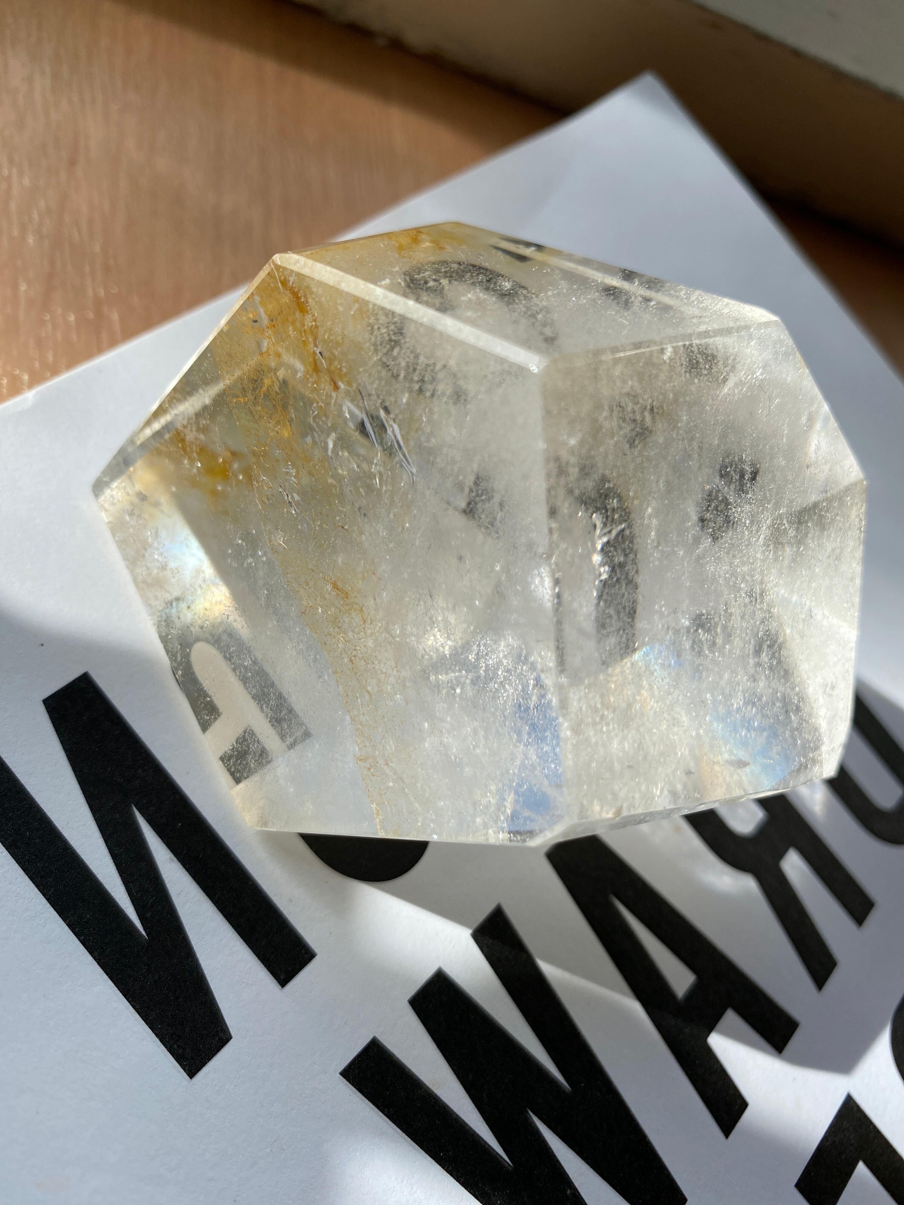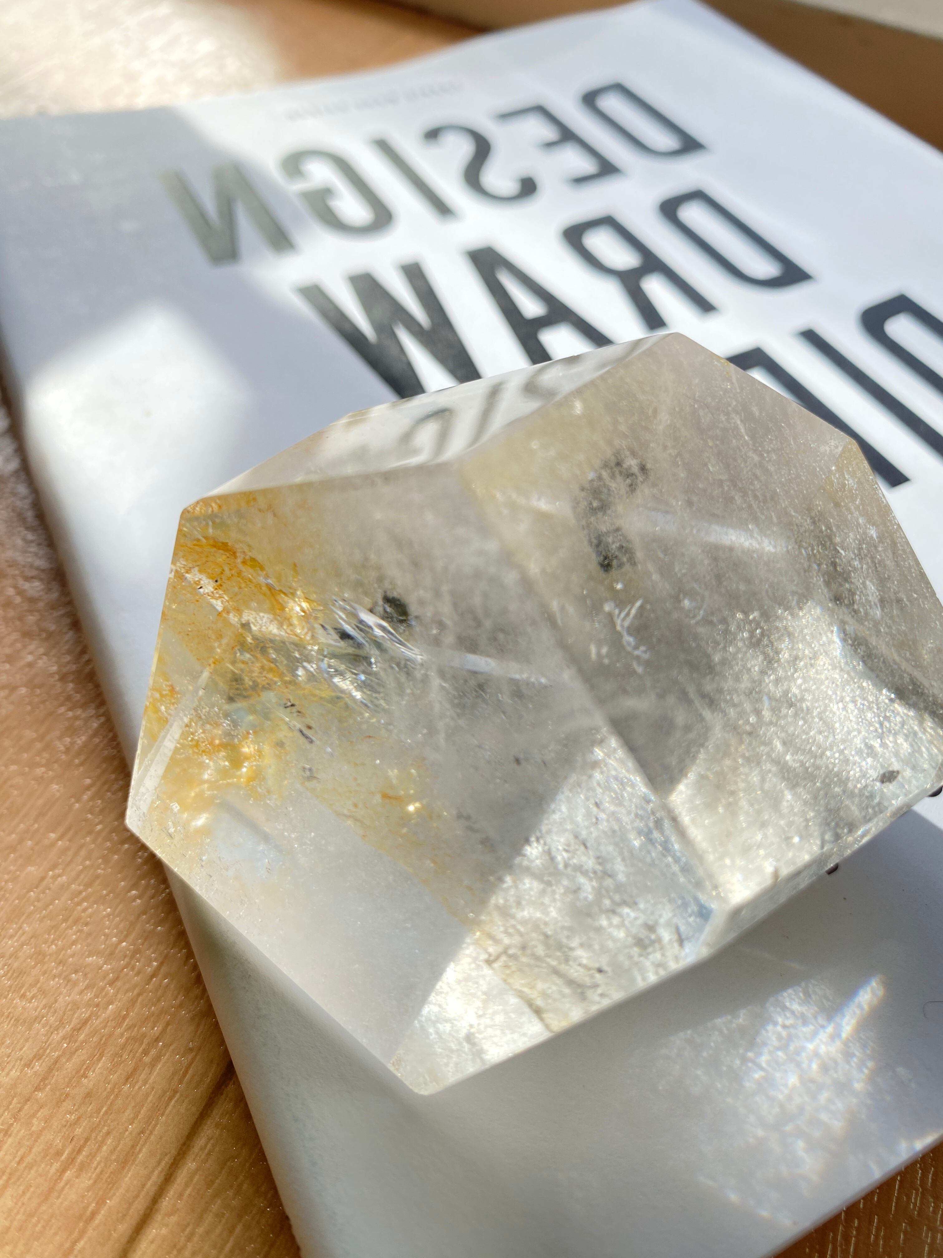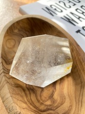 磨かれた艶やかな表面から中まで透明感ある自然のままの水晶の姿を大粒の宝石のようにカットしたお品。