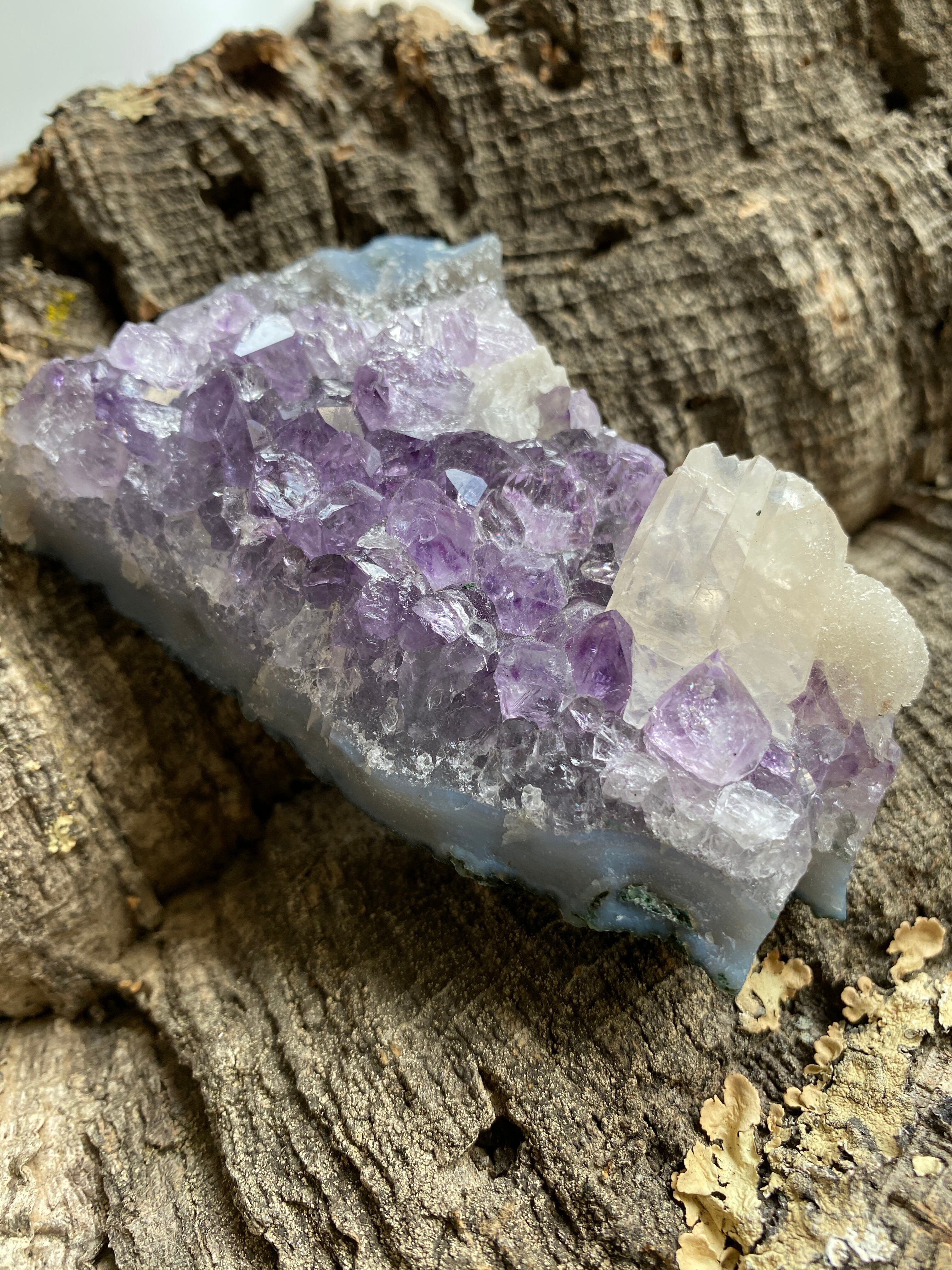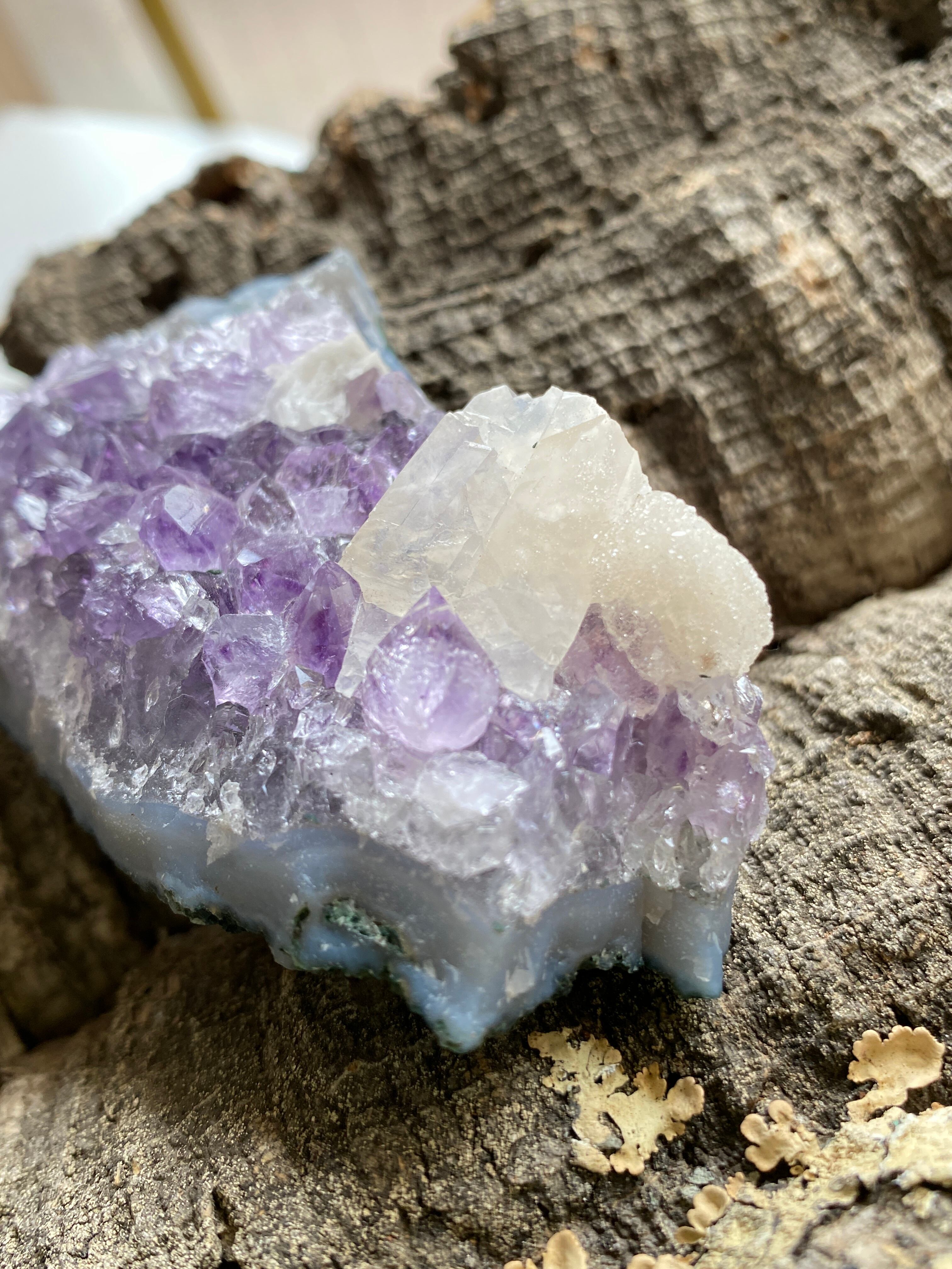 アメジストクラスターにセレナイトが共生した可愛らしいクラスター。セレナイトの癒しパワーがプラス。