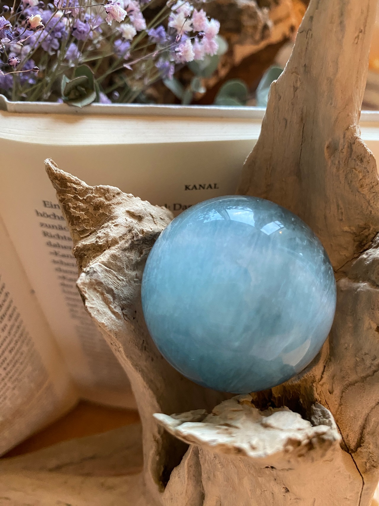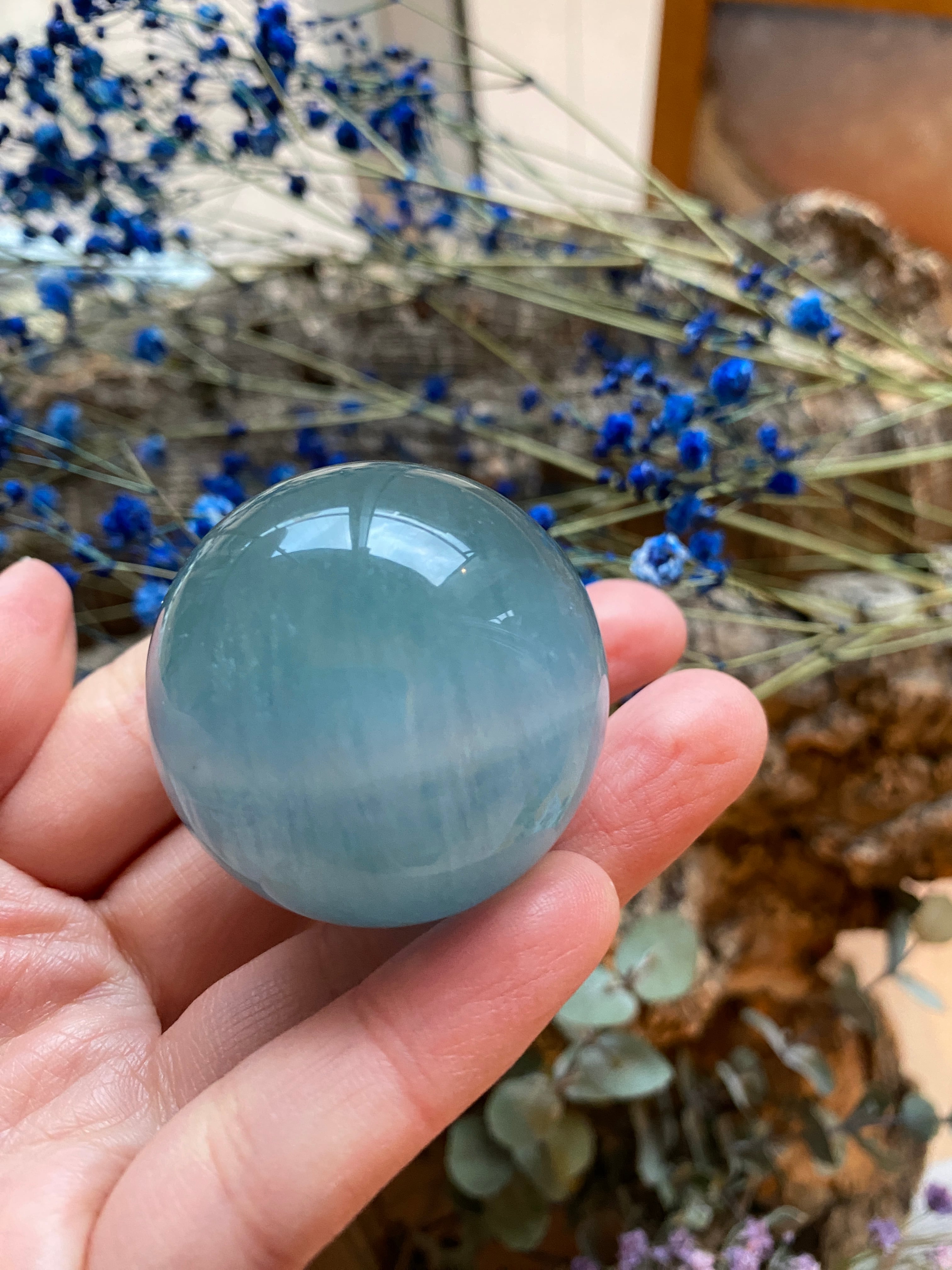 美しい縞模様が特徴的な、ブルーフローライトの癒しスフィア このほんのり縞模様が入ったブルーフローライトスフィアは、非常に美しい一品です。様々なブルーの色調が縞模様と絶妙に調和するため、上品で美しい印象。問題解決へ導く、モヤモヤをとりはらう、新しいトライ、スタートを応援してくれる石